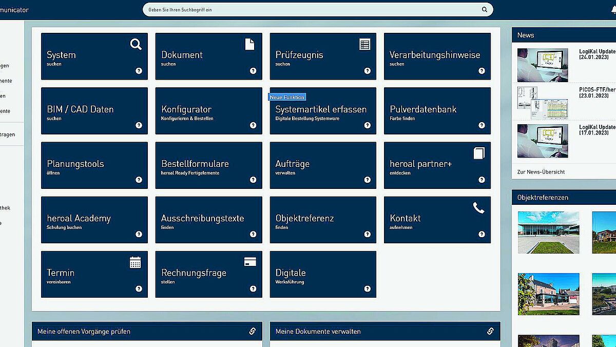 Zügigen Zugriff auf die meisten Services und digitalen Tools erhalten Verarbeiter über den Communicator, das Fachkunden-Portal des Unternehmens. Über eine persönliche Arbeitsumgebung bietet ihnen dieser Communicator auf einer klar strukturierten Oberfläche rund um die Uhr die Möglichkeit zum Abruf von Informationen zur Heroal Systemwelt. Sämtliche wichtigen Dokumente stehen im Document Center stets aktuell zur Verfügung – von Bestell- und Fertigungskatalogen über Prüfzeugnisse, Objektreferenzen und Ausschreibungstexte, BIM- und CAD-Daten bis zu Preislisten. Leicht und intuitiv per Smartphone, Tablet oder PC zu bedienen, erleichtert der Communicator die tägliche Arbeit dank vielfältiger komfortabler Funktionen. Diese erlauben den Partnern des Unternehmens, ihre Prozesse durch die zeit- und ortsunabhängige Abwicklung aller wesentlichen Aufgaben entlang der Wertschöpfungskette mithilfe des Portals zu optimieren.