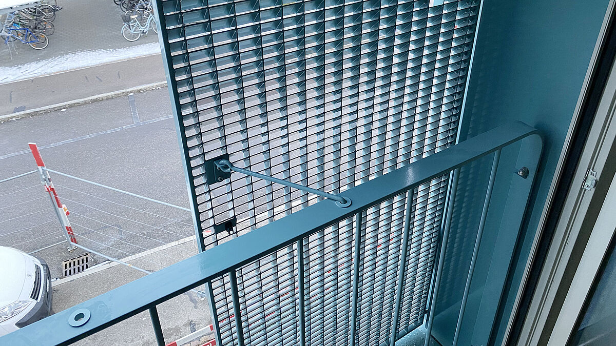 Bei der Wahl des Gitterrosts entschieden sich die Verantwortlichen für einen Lamellenrost – einen Vollrost mit schräggestellten Querstäben. Dieser eignet sich ausgezeichnet als Sicht- und Sonnenschutz, denn die Höhen der Lamellenstäbe (Querstäbe) und die Maschenweiten sind individuell wählbar. Einen weiteren, nicht zu unterschätzenden Vorteil bietet dabei das ästhetisch angenehme Erscheinungsbild. Die Lamellenroste sollten in jeweils drei respektive vier Einheiten als Jalousie dienen. Die Dreier-Elemente bestehen aus fixen Lamellenrosten, welche an den vorab montierten Wandkonsolen eingehängt und verschraubt sind. An die Vierer-Elemente wurden höhere Ansprüche gestellt. Die mittleren beiden Lamellenroste sind – wie bereits erwähnt – nach aussen aufklappbar und gewähren so die freie Durchsicht.
