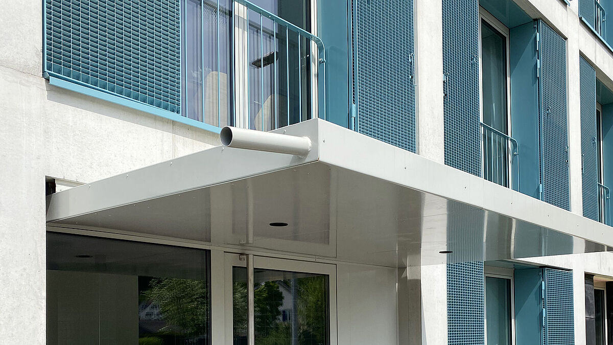 Zum Leistungsumfang der Sprich zählten auch zwei Vordächer sowie zwei Gitterrosttüren (ebenfalls Lamellenroste). Die erwähnten Gitterrosttüren bieten sowohl einen Zugang als auch einen Fluchtweg aus der Einstellhalle im 1. Untergeschoss. Die Gitterrosttüren wurden dabei mit einer Vierkantrohr-Einfassung versehen und mit dem Farbton NCS S2502-Y beschichtet. ■