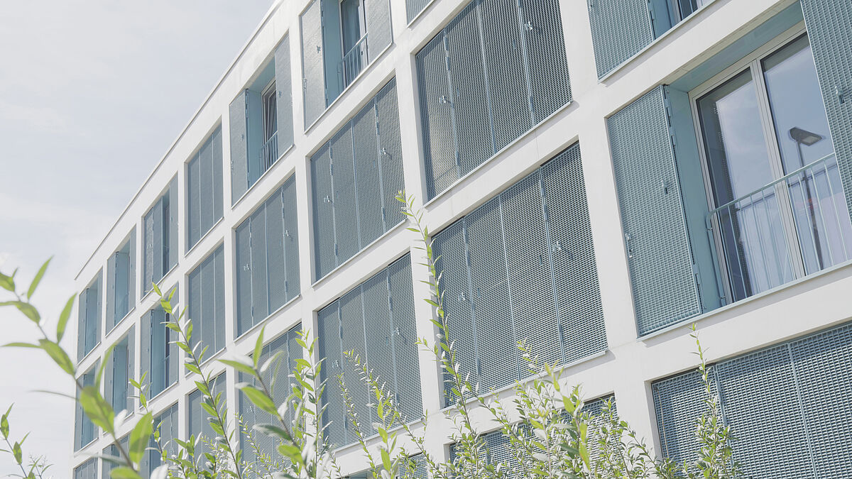 Angenehm und eher zurückhaltend wirkt der langgezogene, sich über vier Geschosse erhebende Neubau. Auffallend markant setzt sich der helle Raster der weissen Fassadenstreifen in Szene. Je nach Lichteinfall unterschiedlich markant zeigen sich die türkisfarbigen, den Lochfenstern vorgesetzten Sicht- und Sonnenschutzelemente aus Lamellenrosten. Von den jeweils vierteiligen Elementen lassen sich die beiden mittleren Elemente durch Drehen um 180° nach aussen umlegen und geben den Bewohnern die Sicht in die Umgebung frei. Je nach Situation, wie sich die Bewohner gerade entscheiden, variieren Anzahl und Anordnung der offenen Elemente, was das Erscheinungsbild des Gebäudes stetig verändert.
