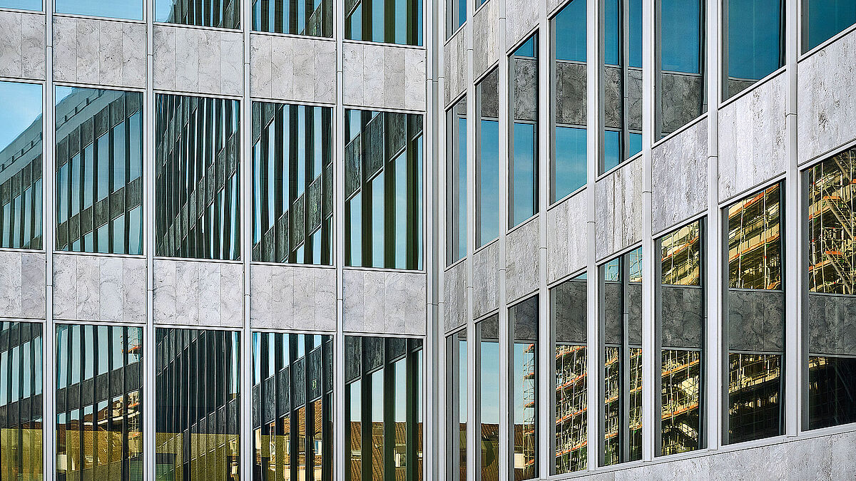 Um dem neuesten technischen Standard zu entsprechen, erhielt die Fassade auf rund 3000 m² neue, grossformatige Scheiben aus dem Sonnenschutzglas eyrise s350. Dank der angewandten Flüssigkristalltechnologie ist damit eine dynamische Verdunkelung auf Knopfdruck möglich. Auf diese Weise kann eine übermässige Erhitzung der Innenräume vermieden und die benötigte Kühlenergie tief gehalten werden. Die eyrise-Gläser sind durch eine Umweltproduktdeklaration (EPD) zertifiziert. Sie werden vollständig in Europa hergestellt, und die Produktionsstätte in Veldhoven (NL) nutzt nachhaltige Energie, was sich positiv auf den Anteil grauer Energie zur Herstellung der Fassade auswirkt.