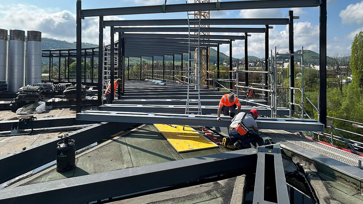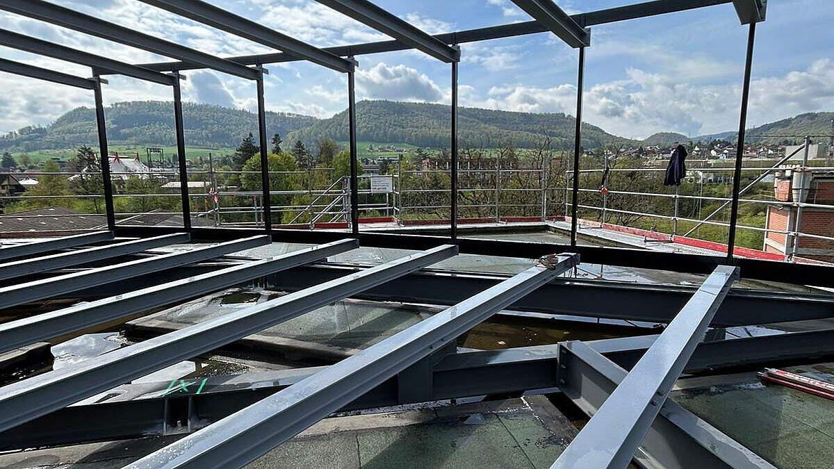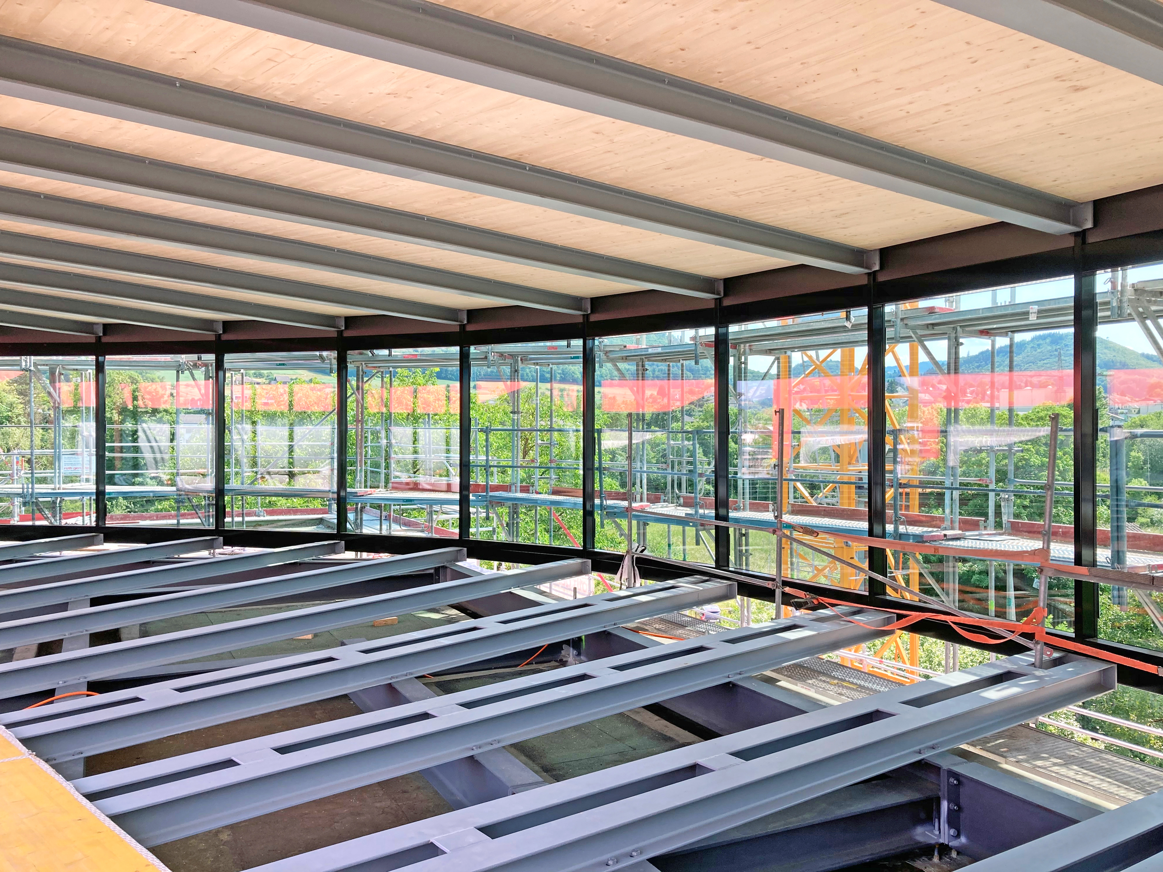 Die Tragkonstruktion ruht teils auf dem Bestandsgebäude, teils greift sie punktuell in dessen Räume ein. Die Primär-Bodenträger verlaufen über die gesamte Fläche des «Loops». Darauf sitzt – fächerartig vom Zentrum ausstrahlend – die sekundäre Tragstruktur: HEB 260-Bodenträger, die mit den inneren und äusseren Pfostenprofilen der Verglasung sowie dem jeweiligen Deckenträger zu fixen Rahmen verschraubt sind. Das Resultat: Die Lasten der Dachkonstruktion werden direkt über die Verglasungspfosten abgetragen. Besonders im Aussenbereich überragen einige Träger das bestehende Gebäude in unterschiedlicher Tiefe. Wo grössere Lasten zu erwarten sind, kamen Doppelträger zum Einsatz – zwei HEB-Profile, verschweisst mit Verbindungslaschen. Alle Boden- und Dachträger verlaufen horizontal und bilden gemeinsam mit Innen- und Aussengerippe der Fassade die tragende, raumbildende Struktur.