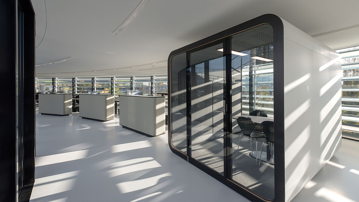 Im Inneren des rund 1000 m 2 grossen «Loops» sind die Arbeitsbereiche offen und doch durchdacht gegliedert. Im äusseren Ring befinden sich 20 Doppelarbeitsplätze, visuell unterteilt durch sechs im Raum freistehende, schallgedämpfte Besprechungsboxen. Der innere Bereich, bewusst als «Wohnraum» konzipiert, beherbergt Empfang, zwei Besprechungsräume, eine Café-Bar, die multifunktionale «Arena» mit LED-Screen – sowie den erwähnten Innenhof. Ein Ort der Begegnung, Erholung und Kreativität.