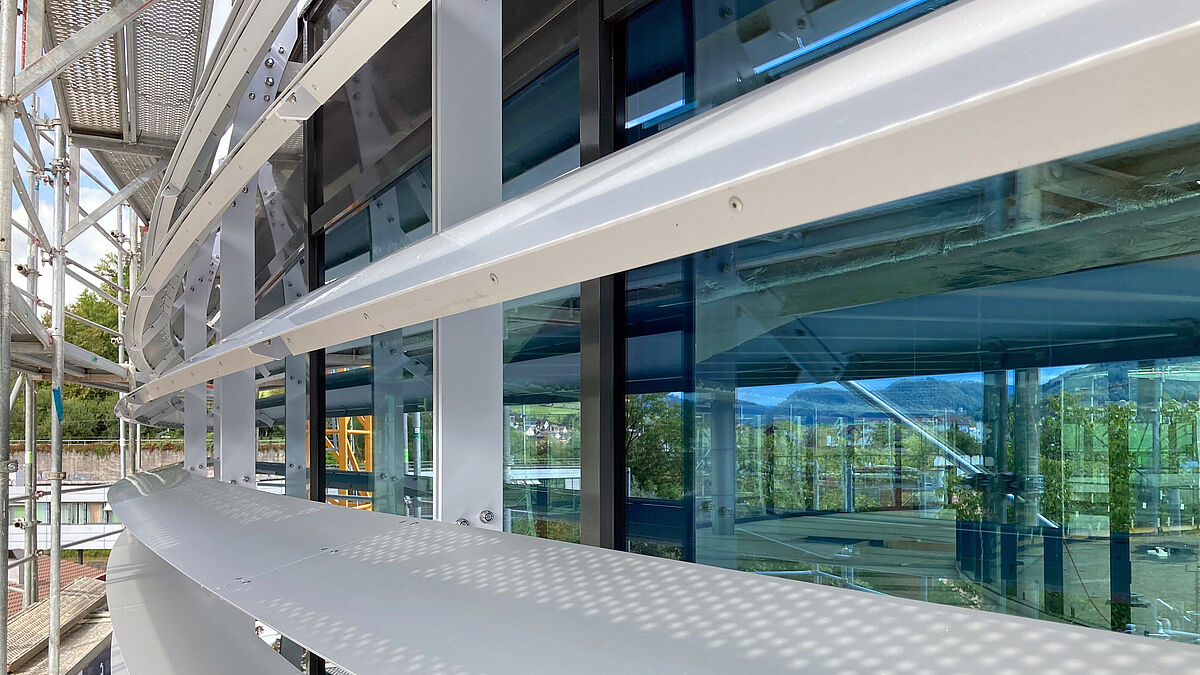 Über 950 meist individuell geformte Blechlamellen, kreisbogenförmig geschnitten und mit Gewindebolzen versehen, sorgen für einen optimalen Blendschutz. Getragen werden sie von einer Haltekonstruktion aus bogenförmigen, vertikal stehenden, zweischnittig geführten Edelstahlblechen mit angeschweissten Konsolen. So konnten die Lamellen teilfixiert, in Form gedrückt und passgenau verschraubt werden – jede ein kleines Unikat.