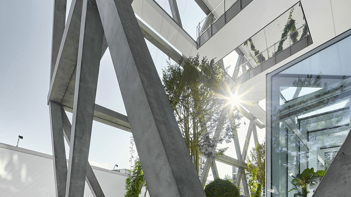 Voraussetzung für das stützenfreie und damit äusserst flexible Open-Office-Konzept ist die V-förmige, massive Fassadenstruktur, die in Kombination mit den zentralen technischen Erschliessungstürmen das Tragwerk bildet. Der Hybrid aus Stahlbeton und eingegossener Stahlkonstruktion trägt an den Knotenpunkten das gesamte Gebäude. Mit diesem speziellen Fassadenkonzept verfügen die Büros über grosse innenarchitektonische Flexibilität und eine Tageslichtausleuchtung mit einem Faktor von über 2.