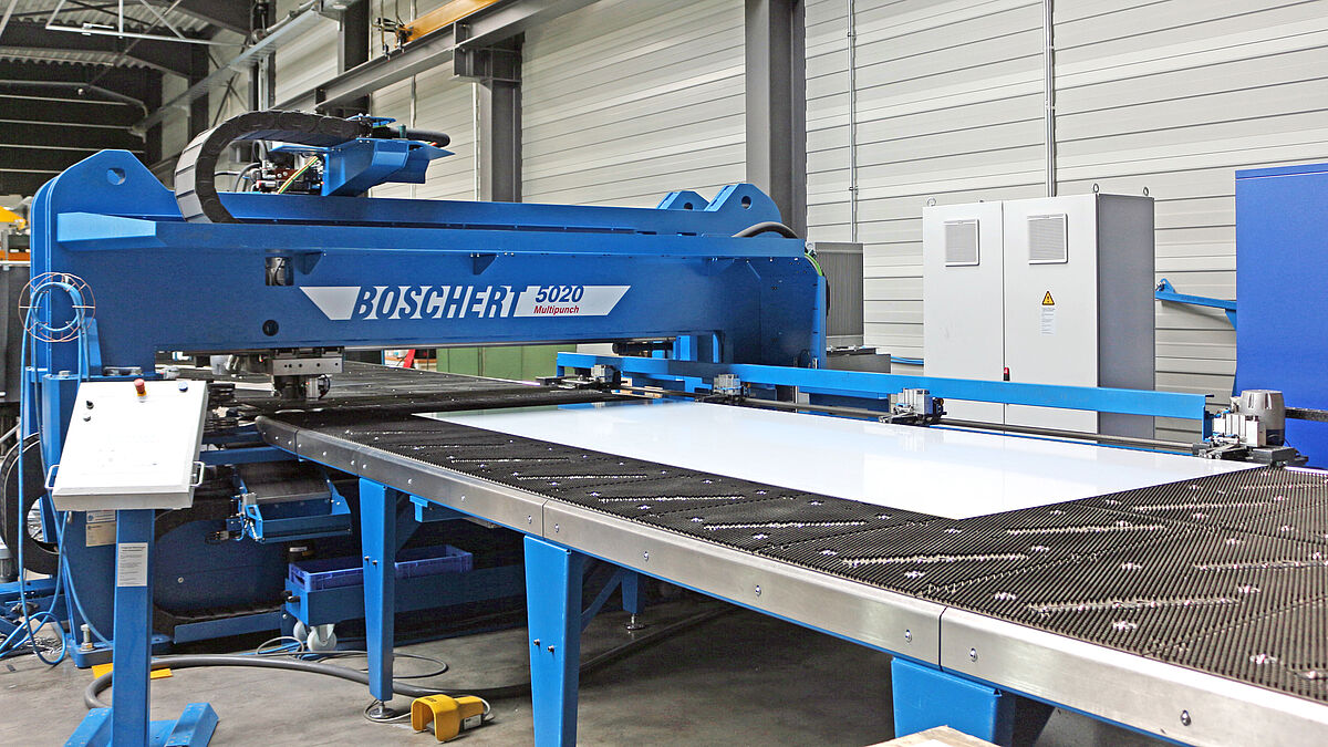 «Die 5020 basiert auf der bewährten 4020, der Maschinentisch ist aber nochmal einen Meter länger», sagt Roser. Das erleichtere die Arbeit mit den Superformat-Blechen erheblich. Rückgrat der Boschert 5020 ist ihr robuster O-Rahmen. Dieser stabilisiert die Maschine wie die geschlossenen Spanten ein U-Boot. So können Anwender die 28 Tonnen Stanzkraft der 5020 schnell und wiederholgenau nutzen. Die Maschine kann bis zu 6 mm dicke Bleche stanzen, nibbeln, formen und markieren. Dabei reduziert der Zwölffach-Werkzeugwechsler die Nebenzeiten deutlich. Die 5020 ist mit zwei Stanzköpfen ausgerüstet. Der obere Stanzkopf mit 55 mm Stanzhub ist mit einer HDE-Hydraulik ausgestattet, die einen schnellen Hub und eine genaue Stanzung gewährleistet. Der Stanzkopf ist stufenlos um 360 Grad drehbar und verfügt über eine Boschert-T-Nut als Werkzeugaufnahme, die alle Trumpf-Standardwerkzeuge bis Grösse drei fassen kann. Zudem verfügt die Maschine über eine aktive Matrize mit automatischer Richtfunktion zum Stanzen von unten. Der untere Stanzkopf mit 25 mm Stanzhub ist wie der obere ausgestattet. Die maximale Hubfolge der 5020 beträgt 800 Hübe pro Minute.
