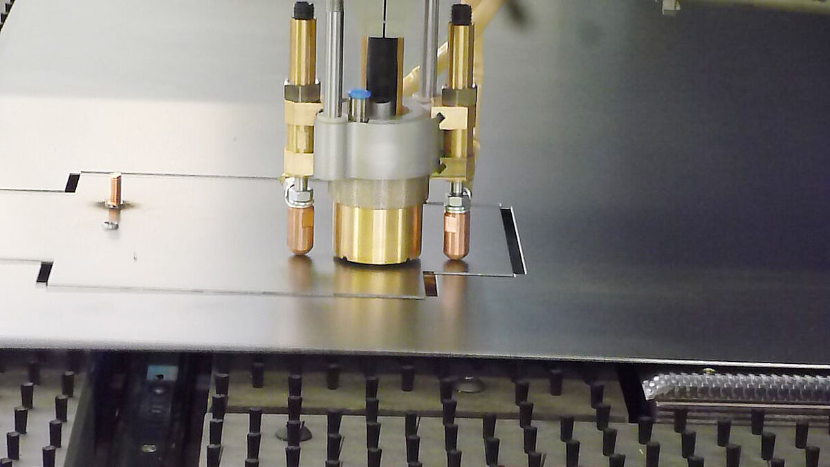 Neben dem grösseren Tisch verfügt die Stanzmaschine auch noch über eine weitere Besonderheit: ein Bolzenschweissgerät mit automatischer Bolzenzuführung. Dieses besteht aus dem Schweissgerät, dem Automatik-Bolzenschweisskopf mit Digitalanzeige und der vollautomatischen Zuführung. Der Aufbau mit spielfreien Kugellagern sorgt für Präzision und Wiederholgenauigkeit. Es ist links hinten über der Hydraulik der Stanzmaschine montiert. Das vereinfacht das Nachfüllen oder Wechseln der Schweisselemente sowie die Einstellung des Geräts. Der Bolzenschweisskopf wird links neben dem Stanzkopf aufgebaut, die Zustellung auf Blechhöhe funktioniert pneumatisch. Durch die digitale Anzeige der Schweisskolbenposition kann diese über ein integriertes Messsystem auf 1/100 mm eingestellt werden. Anwender können Schweisselemente mit Durchmessern von 3 bis 8 mm und Bolzenlängen von 8 bis 50 mm ohne Umrüstung verwenden. Der Schweissvorgang dauert – abhängig von Material und Bolzendimension – zwischen einer und drei Millisekunden pro Stück. Damit lassen sich zwischen 21 und 40 Bolzen pro Minute schweissen – wirtschaftlich, prozesssicher und präziser als von Hand. Dies sei vor allem bei der Herstellung von Fassadenteilen ein sehr grosser Vorteil und würde immer wichtiger. Diese werden mit den Bolzen befestigt und die Verbindungen müssen bombenfest halten. Man müsse beim Wenden der Bleche nur darauf achten, dass diese keine Kratzer abbekommen und die Oberflächenqualität nicht leide.