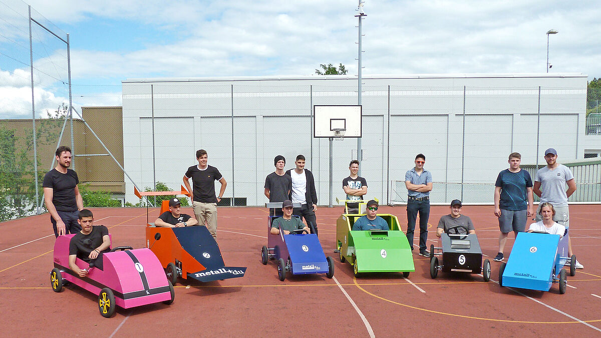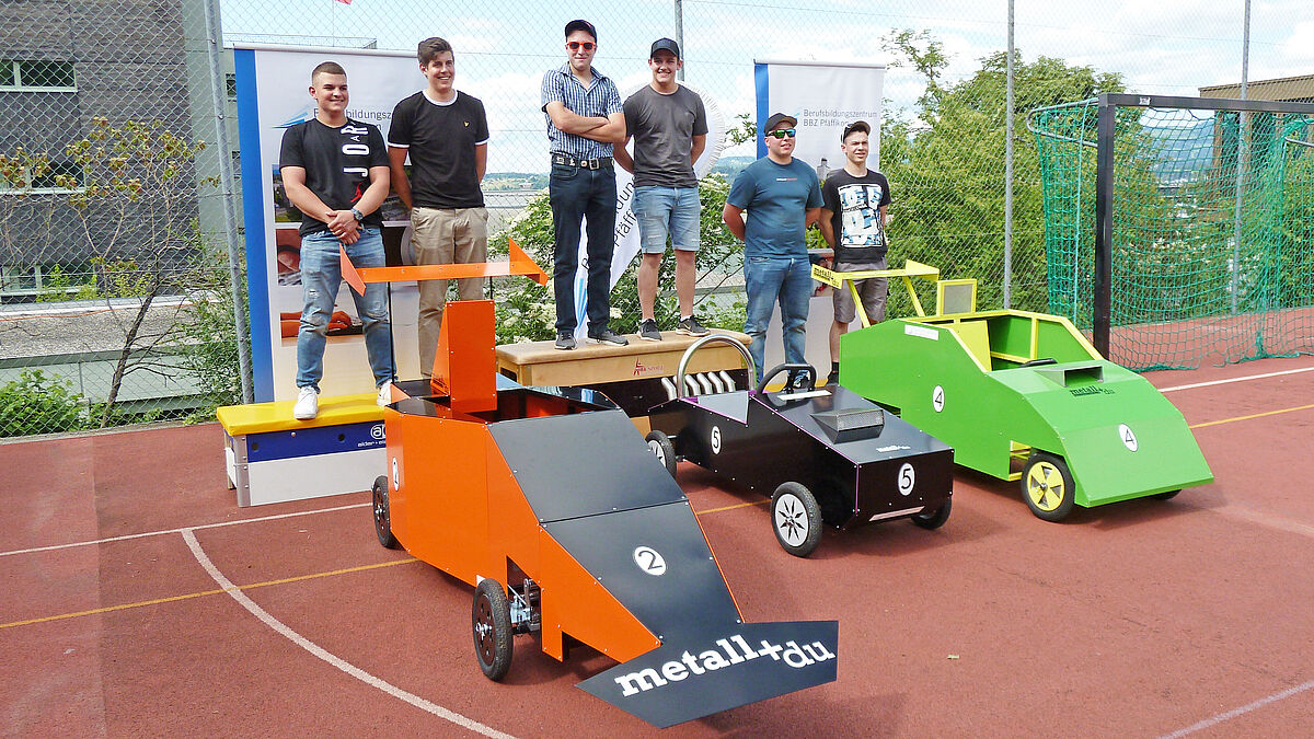 Es war ein wunderbarer Nachmittag im Vorsommer: Die Sonne strahlte und brachte die Reifen der farbigen Boliden auch ohne Aufwärmrunde auf Betriebstemperatur. Besucht wurden das grosse Rennen und die entsprechende Präsentation von rund 80 Personen. Eltern, Lehrmeister, Sponsoren und Vertreter aus Wirtschaft und Politik waren gekommen, um zu sehen und zu hören, was die jungen Berufsleute während der vergangenen Wochen geplant, gebaut und erlebt hatten.