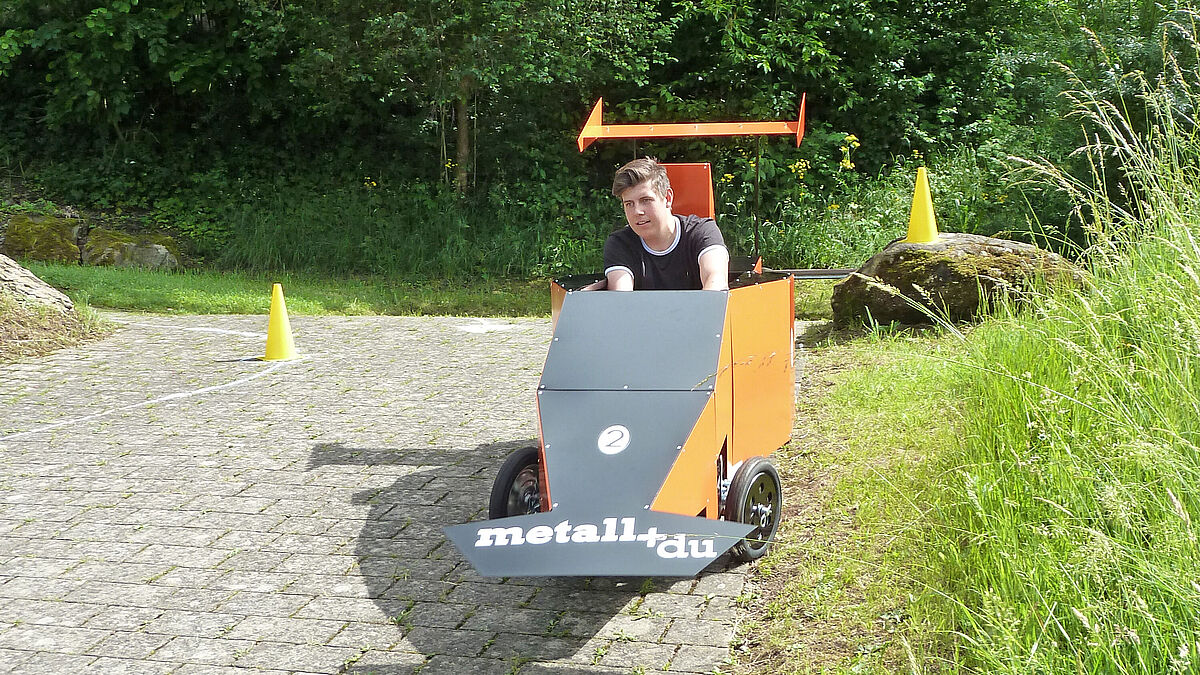 Anschliessend galt es, das erst skizzenhaft dargestellte Gefährt konstruktiv zu erfassen und im CAD in geometrische Linien umzuwandeln. Hierfür hatte – so Rolf Züger – jeder Lernende freiwillig einen CAD-Zeichnungskurs absolviert. Es galt, die Seifenkiste als Ganzes zu planen, aber auch jedes einzelne Metallteil sollte für die Herstellung genau aufgezeichnet werden. Gemäss Aussagen der Lernenden wurde die Planung nicht bei allen Teams gleich intensiv wahrgenommen. Während die einen alles höchst genau planten und beim Zusammenbau von der Exaktheit der Teile profitierten, hatten diejenigen, die weniger Energie in die Planung investiert hatten, beim Zusammenbau doch verschiedene Male zu improvisieren. Diese Erfahrung generierte bestimmt bei allen Beteiligten eine wertvolle Erkenntnis.