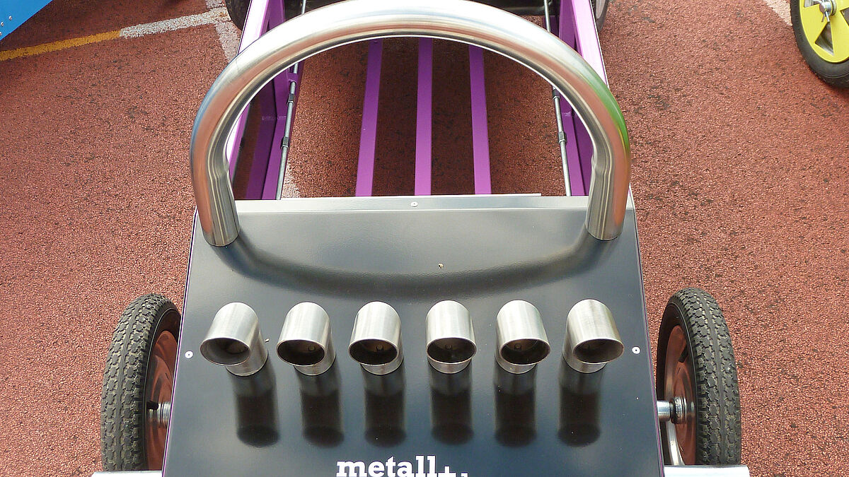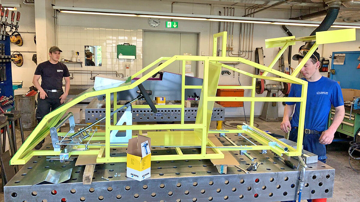 Schon bald nach den selbständigen Bestellungen waren die verschiedenen und individuellen Materialien eingetroffen. Im Überbetrieblichen Kurs (ÜK) unter der Leitung von Hansjörg Naef wurden die Materialien zugeschnitten, angezeichnet, gebohrt, gefräst, gebogen und schlussendlich zu ihren Gebilden verschweisst, verschraubt oder vernietet. Für das statische Gestell kamen generell Profilstahlrohre zur Anwendung. Für die Verkleidungen wählten sie Bleche aus Aluminium. Auffallend an der Präsentation war, dass bis auf eine einzelne Gruppe alle vorzugsweise Flachbleche verwendeten und nur ein Fahrzeug mit rundgewalzten Verkleidungsblechen zu sehen war. Dafür liessen sich die Metallbauer beim Zubehör einiges einfallen. Neben veredelten Auspuffanlagen, messerscharfen Spoilerblechen, und strukturvollen Felgenabdeckungen waren auch glänzende Warnhupen und edelstählerne Bodenverkleidungen zu sehen.