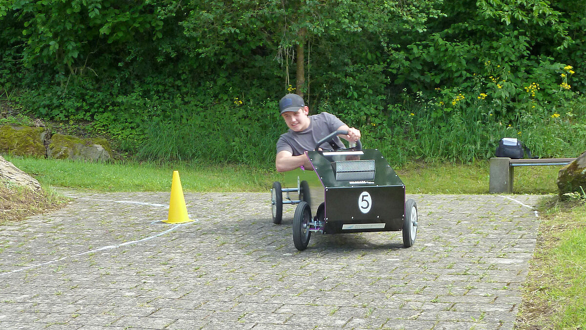 Endlich war es so weit, sie schoben die Fahrzeuge bergauf zum Start hinter der Schulanlage. Auf einer kurvigen Strecke rollten und rasten die Fahrer auf quietschenden Rädern die Strasse hinunter. In zwei Läufen, sodass jeder einmal Anschieber und einmal Pilot war, legten sie sich mutig in die zum Teil scharfen Kurven. Neben den schnellen Zeiten erfreute auch die Tatsache, dass alle Fahrer das Ziel gesund erreichten, sich an den Fahrzeugen keine Teile lösten und somit keine Räder ihre Fahrzeuge überholten.