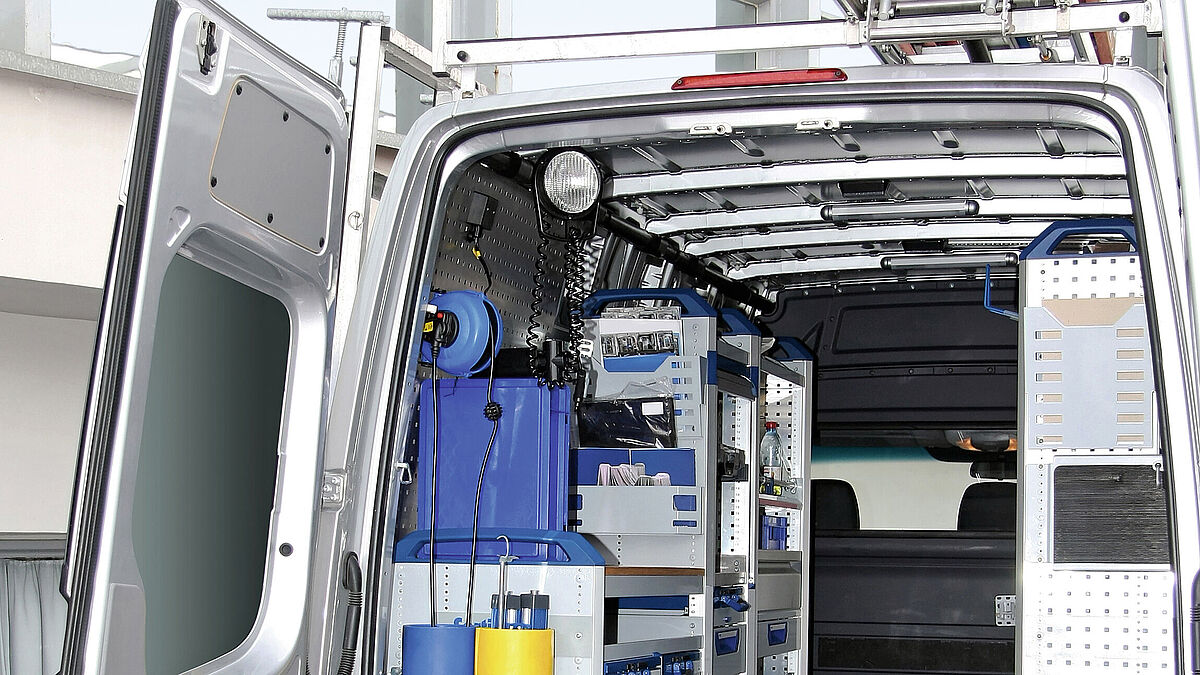 Der Ausrüstungsbedarf eines Montage- oder Servicefahrzeugs ist branchen- und unternehmensspezifisch unterschiedlich. Für den Unternehmer kann es lohnenswert sein, etwas Zeit zu investieren und sich konzeptionelle Einrichtungsgedanken zu machen und diese mit einem professionellen Anbieter zu besprechen und zu optimieren. Ausstattungskonzepte sind weitgehend markenunabhängig und können für verschiedene Fahrzeugmarken und -typen angeboten werden. Gewisse Anbieter empfehlen bei Kastenwagenformen den Einbau eines doppelten Bodens. Da in den meisten Fällen die Raumhöhe nicht im vollen Volumen ausgeschöpft wird, kann eine Unterteilung durch den Zweitboden für die Verstauung von Leitern usw. durchaus Sinn machen. Im Innenraum bieten spezielle Halterungen für Geräte und Maschinen eine erhöhte Sicherheit, und Werkstatteinrichtungen wie Schraubstöcke und Werkzeugschubladen ermöglichen ein flexibles und qualitativ hochstehendes Arbeiten vor Ort. Um effizient und wirtschaftlich arbeiten zu können, müssen die im Fahrzeug mitgeführten Infrastrukturen schnell auffindbar und griffbereit sein. Langes Suchen kostet Zeit und Nerven und sollte der Vergangenheit angehören. Zudem: Wer Bauteile, Werkzeuge, Maschinen und Ersatzteile richtig verstaut, erreicht auch ein Maximum an Ladungssicherheit bei Kurvenfahrten oder Vollbremsungen.