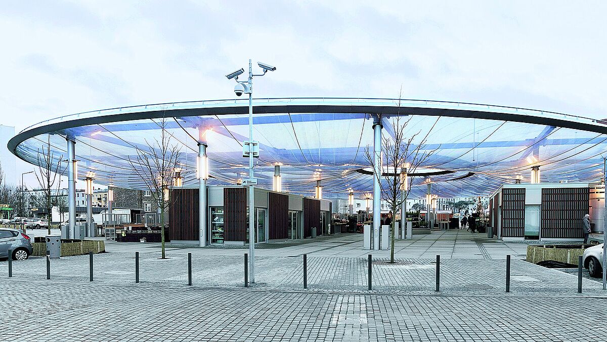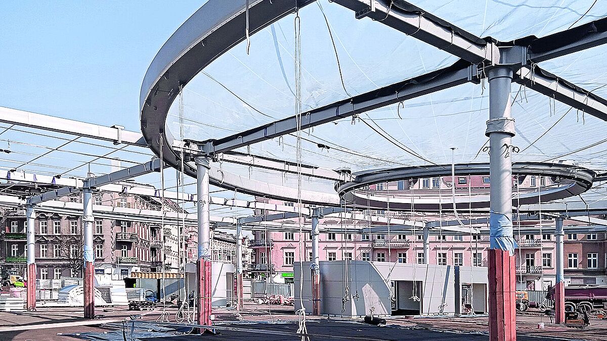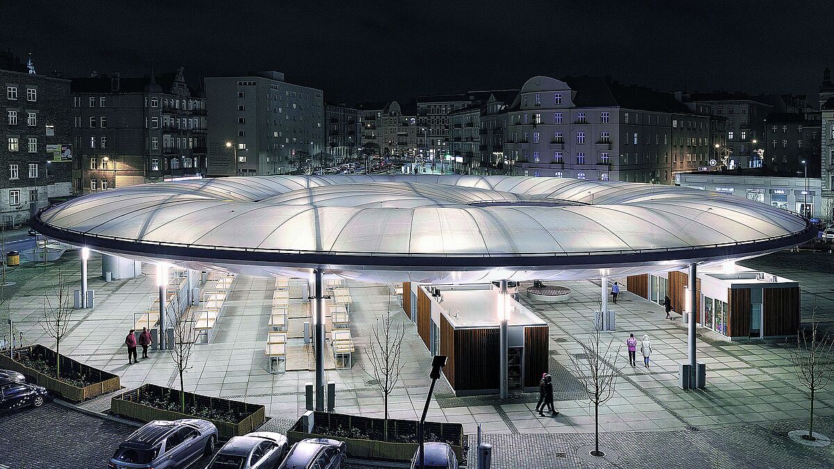 Für die grossflächige Überdachung eines Marktplatzes in Posen (PL) kamen grossformatige ETFE-Folienkissen zur Anwendung. Speziell und anspruchsvoll am Entwurf von Jacek Bułat ist auch die ausserzentrische Anordnung des inneren Rings. Geplant und technisch umgesetzt wurde der Entwurf von formTL Ingenieure, Radolfzell (DE).