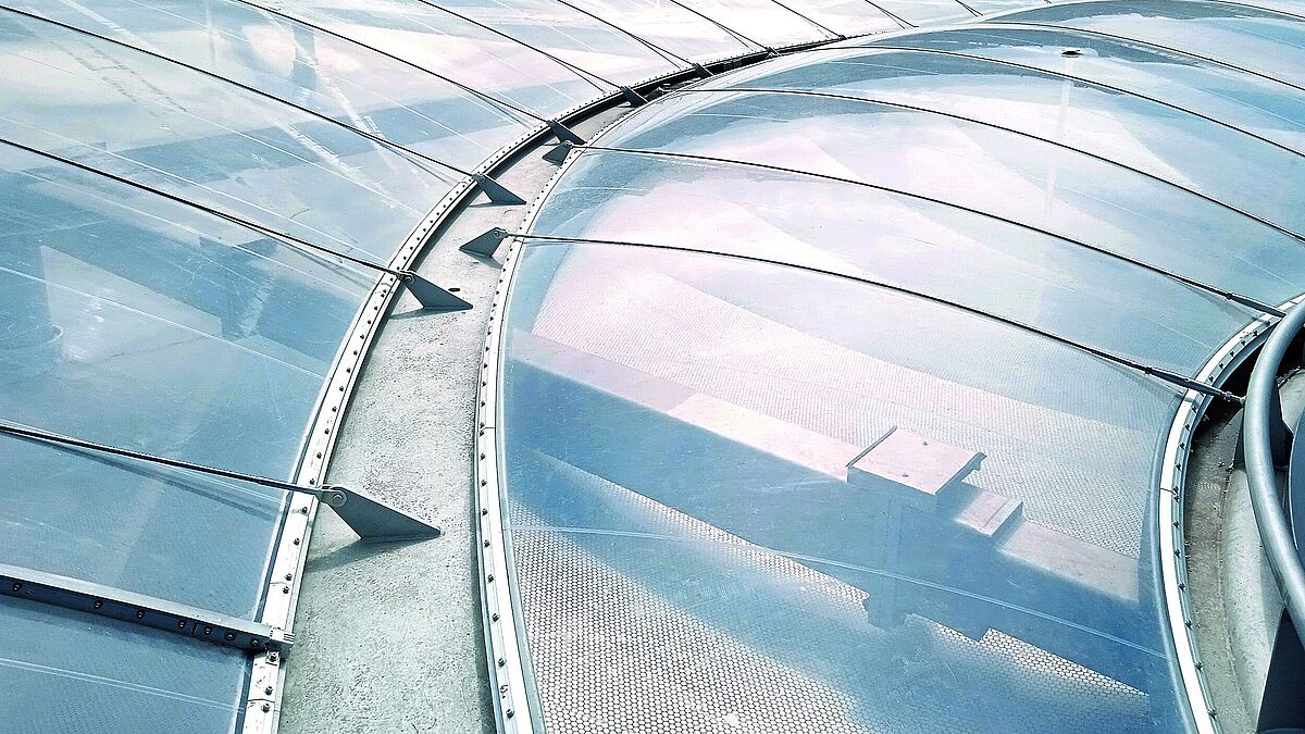 Das gebaute Ergebnis geht auf den Entwurf des ortsansässigen Architekten Jacek Bułat und des Breslauer Tragwerksplaners Andrzej Kowal zurück. Sie entwarfen ein helles und offenes, gleichzeitig witterungsgeschütztes Areal von rund 2400 m 2 überdachter Fläche; 55 m ist der Durchmesser der neuen Konstruktion und damit eines der bisher grössten als Ein-Kammer-System konzipierten Foliendächer überhaupt. Getragen wird das Kissendach von einem rund 6,3 m hohen Stahl-Trägerrost, in das ein äusserer, ein mittlerer und einen innerer Ring eingebettet sind. Der Rost selbst wird gebildet aus orthogonal verlaufenden Kastenprofilen mit biegesteifen Anschlüssen an Rundrohr-Stützen. An den drei Ringen schliessen mittig die pneumatischen, zweilagigen ETFE-Folienkissen an. Die Tragwerks- und Werkstattplanung dieser transparenten Bauteile sowie der Schnittstellendetails verantwortete das Büro FormTL.