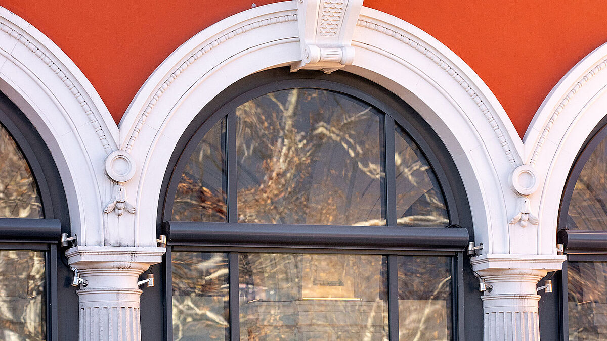 Im Rahmen der Renovierung wurden die ursprünglichen Fenster- und Türelemente durch moderne, wärmegedämmte Stahlprofile ersetzt. Die Officine Cameroni SA verwendete hierfür Spezialprofile auf Basis des Janisol-Systems. Dabei kam die Erfahrung des Unternehmens zum Tragen, da sie die technische Umsetzung insbesondere der anspruchsvollen Radien der Rundbögen erleichterte. Das hochwärmegedämmte Fassadensystem Jansen VISS HI 50 und die in die Fassade integrierten Janisol-Fenster kamen sowohl im Innen- als auch im Aussenbereich zum Einsatz. Mit Blick auf die Sicherheit fiel die Wahl auf die Jansen Fassade VISS 50 RC3 und die Jansen Brandschutzfassade VISS Fire EI30. Ergänzt wurde dieses Konzept durch die Jansen Türen Janisol und Janisol 2 EI30. Die Brandschutztürsysteme Jansen Janisol 2 EI30 und die Jansen Brandschutzfassade VISS Fire EI30 erfüllen die Anforderungen an die bauliche Sicherheit und gestalterische Freiheit wie kein anderes System. Sie sind ausgesprochen filigran und gleichzeitig sehr stabil.