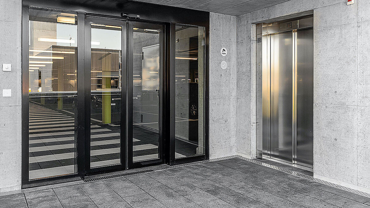 Im Objekt kamen diverse Erschliessungselemente von Forster zum Einsatz, die Sicherheit und Funktionalität mit einer ansprechenden Gestaltung verbinden. So dienen insgesamt neun Brandschutz-Schiebetüren mit Fluchtwegfunktion als Abschluss- oder Windfangtüren für die verschiedenen Parkdecks. Die hier eingesetzten Türen des Systems Forster Fuego Light verfügen über eine Swing-in- und Swing-out-Funktion, mit der sich die Schiebeelemente im Brandfall als Drehflügel öffnen lassen und die Fluchtwege sicherstellen. Die in die Sichtbetonkonstruktion verankerten, schlanken Profile sind schwarzbraun pulverlackiert und bilden dadurch einen Kontrast zur allgegenwärtigen Betonoberfläche. Die Schiebetüren erfüllen die Brandschutzklasse EI30, die Seitenteile sogar EI60. Beide Elemente sind mit Brandschutzglas Fireswiss Foam ausgestattet. Mit Schiebetürantrieben lassen sich die Flügel automatisch öffnen.