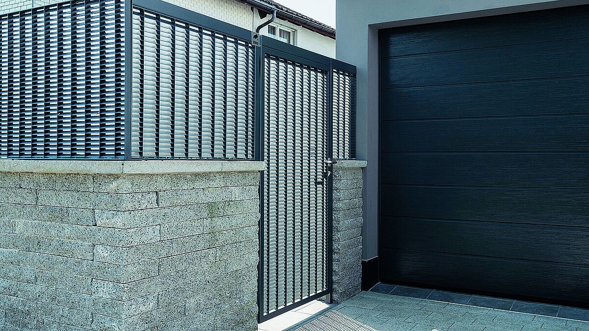 Bei der Montage war die Koordination mit dem Gartenbauer gefragt, welcher für die bauseitige Steinwand verantwortlich war. Nach deren Fertigstellung erfolgte die Montage der Lamellenroste mittels verlängerter Einfassung und Schlaganker auf der Steinwand. Die Anforderung hierfür lautete: fluchtende Maschen. Im Anschluss erfolgte die Montage der Türen. ■