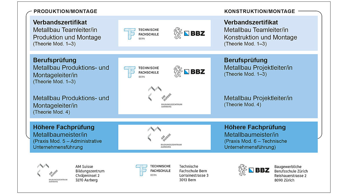 Um einen hohen Weiterbildungsstandard zu gewährleisten, haben sich die drei Schulanbieter Baugewerbliche Berufsschule Zürich (BBZ), AM Suisse Bildungszentrum Aarberg (BZA) und die Technische Fachschule Bern (TFB) sowohl für die Verbandszertifikate als auch die revidierte Höhere Berufsbildung zusammengeschlossen. Sie bieten diese Weiterbildungskurse in Zukunft gemeinsam an. «Wir können mit dieser Zusammenarbeit unsere vorhandenen Stärken bündeln. Jede Schule vermittelt jenes Wissen, auf das sie bereits heute ausgelegt ist», erklärt George Burkhard, BZA Fachbereichsleiter Metallbau. Er führt weiter aus: «Wir sind vom Erfolg dieser Zusammenarbeit überzeugt.»