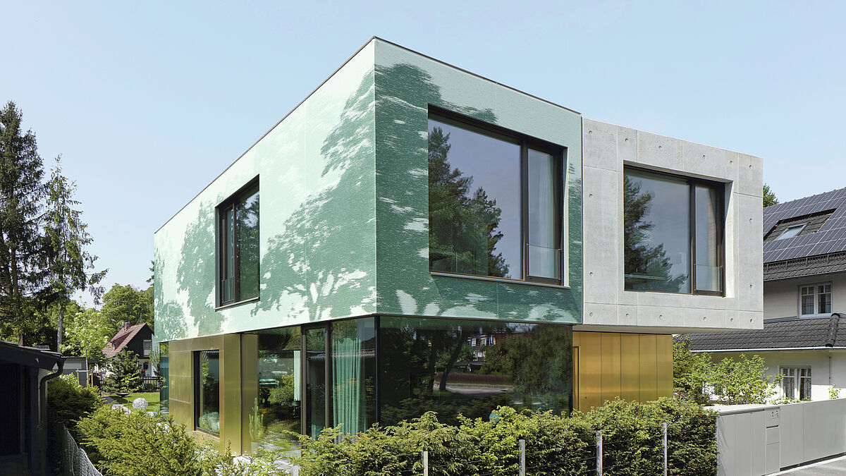 Die Strassenansicht spiegelt das Entwurfsmotiv des «Hauses am Scheitelpunkt» aufs Beste wider: Sie zeichnet den Verlauf des halbkreisförmigen Strassenraums mittels zweier leicht zueinander geneigter, unterschiedlicher Hälften nach. Der nördliche Abschnitt besteht aus Dämmbeton und ist im Erdgeschoss mit Messing verkleidet. Diese Bauwerkshälfte wirkt kompakt, geschlossen, standhaft. Die in ihrem Wesen leichte, südliche Haushälfte wird aus einer raumhohen Verglasung auf Strassenebene umschlossen, mit einem bedruckten Textilumhang im Obergeschoss. Die 25 Meter lange Bahn aus graugrünem wetterfestem Gewebe, die sich um den gesamten südlichen Teil des Hauses windet, ist mit einer Grafik bedruckt, die den Schattenwurf von Bäumen zeigt. Gehalten wird der Umhang über vertikale Schienen an den Gebäudeecken und zwei horizontalen Führungsschienen entlang der Attika und der Verglasung im Erdgeschoss. Die Bahn liegt rund 15 cm vor der Tragkonstruktion und der gläsernen Haut. Zum Garten hin fächert sich das Gebäude – dem trapezförmigen Grundstück folgend – auf. Dabei schiebt sich der monolithische Baukörper rund 2 Meter vor den leichten Teil.