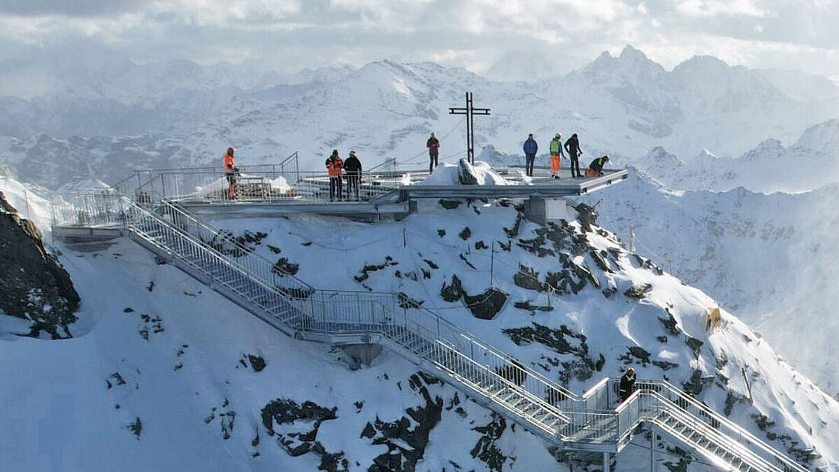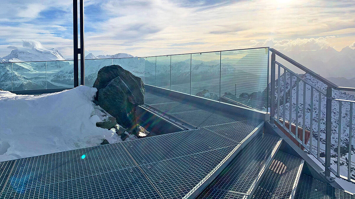 Oberhalb der Ankunftsstelle der Mont-Fort-Seilbahn auf einer Höhe von 3334 Metern ü. M. gelegen, bietet die neue Panoramaplattform einen atemberaubenden Blick auf Alpengipfel wie Mont-Blanc, Grand Combin und das Matterhorn. Dank der neuen Aussichtsplattform, ausgestattet mit dem Schweizer Glasgeländer von CREA, lässt sich das weite Panorama auf dem Gipfel des legendären Mont-Fort nun auch sicher geniessen.