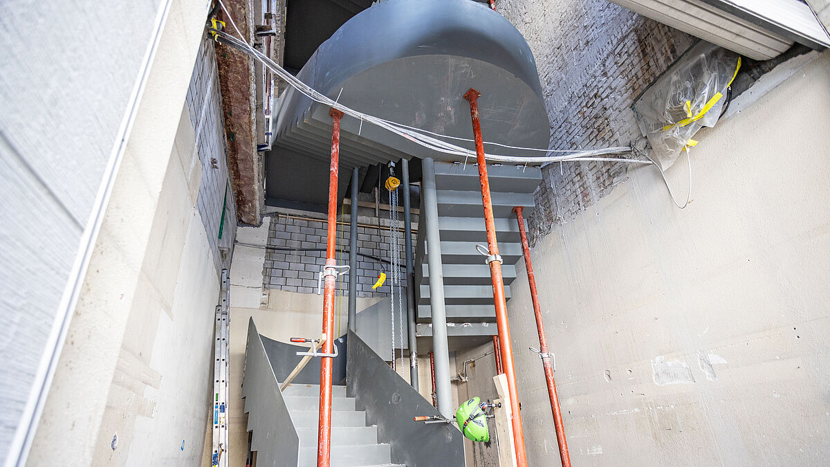 Eine aussergewöhnliche Wendeltreppe hat die auf den Treppenbau spezialisierte Ferdinand Hasler AG in Altstätten mitten in Zürich, an der Pelikanstrasse, realisiert. Das Büro- und Geschäftshaus «Felsenhof» nahe der Bahnhofstrasse wurde 1927 vom Architekten Hermann Weideli als Zeugnis des Art déco und des späten Expressionismus in der Zürcher Architektur gebaut. Nun wird es saniert und dabei bis auf die Grundstruktur zurückgebaut. Die Bauübergabe erfolgt im Frühjahr 2024.