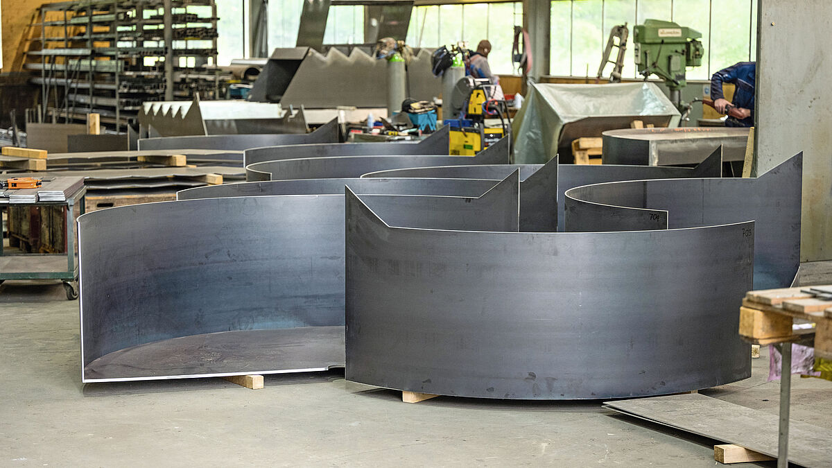 Die sechsgeschossige Treppenanlage mit ihren zwölf Zwischenpodesten wurde im Werk der Ferdinand Hasler AG in 26 Einzelelementen als Schweisskonstruktion hergestellt. Für die Ausführungsplanung kam die 3D-Software HICAD zur Anwendung.