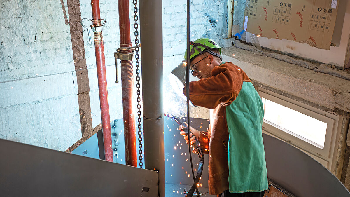 Die Montage startete im Erdgeschoss. Die einzelnen Treppenelemente und die Stützen wurden geschossweise aufeinandergesetzt und verschweisst. Diese Vorgehensweise erforderte auch das Arbeiten in schwindelnder Höhe direkt an der Schachtkante oder auf der jeweils höchsten Stufe. Diese delikaten Arbeiten führten die Monteure in Kletterausrüstung mit den entsprechenden Sicherungsgurten aus. Beste Grundlage für die Positionierung und Ausrichtung der Treppenanlage bildete die exakte Massaufnahme und Kennzeichnungen für die Montage mit dem Theodolit.