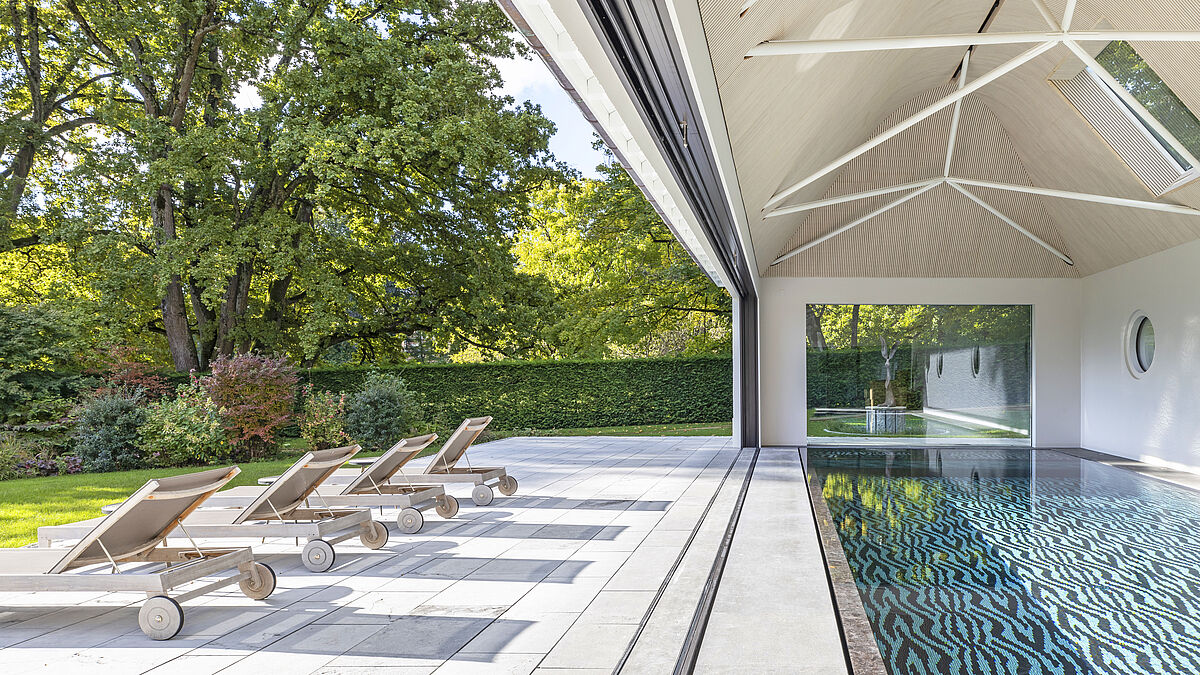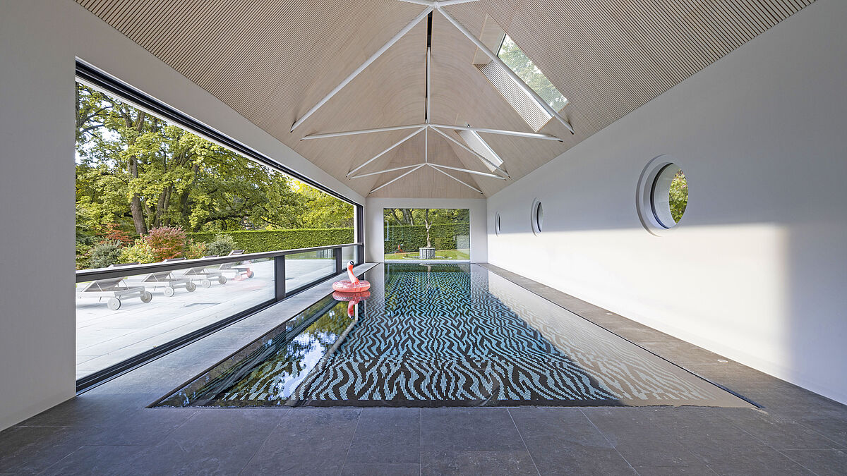 Das heimliche Herzstück des Anwesens am Genfersee ist das an das Haupthaus neu angebaute Poolhaus. Es besticht mit geometrischer Klarheit und einer beeindruckenden Länge. Gleichzeitig verbreitet es maritimes Flair bis ins Detail. Die runden Bullaugen sind eine Hommage an die Seefahrt und den Segelsport und auch der Boden des Schwimmbeckens springt ins Auge. Er ist aussergewöhnlich gestaltet und erinnert ein wenig an den Art-déco-Stil: Ihn ziert ein auffälliges schwarz-weisses Wellenmosaik als Muster – ganz so, wie es Anfang des 20. Jahrhunderts Mode war. Der Schwimmbadboden bildet so einen wundervollen Kontrast zur schlichten Eleganz der Dachkonstruktion. Diese wiederum ist dem Rumpf eines TF35, einer neuartigen Rennbootklasse, nachempfunden.