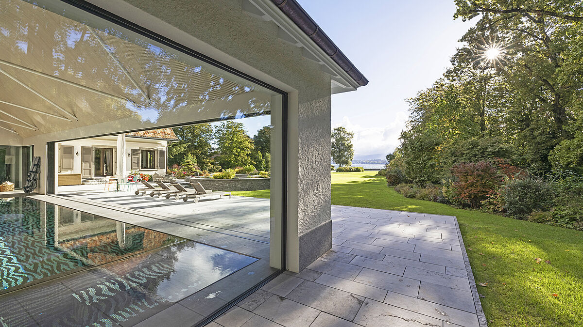 Es ist fast zu schön, um wahr zu sein: eine beeindruckende Villa am Genfersee, dazu ein parkähnlicher Garten und als Krönung ein Poolhaus. Estravaganza Architectes haben ein Objekt geschaffen, das sich nur mit einem einzigen Satz umschreiben lässt: Es ist ein kleines Paradies. Die riesige Fensterfront zum See hin kann auf Knopfdruck lautlos heruntergefahren werden.