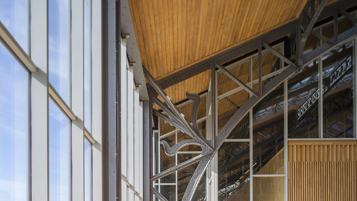 Die insgesamt 20 grossflächigen Glasfassaden an den Giebelseiten der Pavillons, jeweils eine Fläche von 215 m 2 , wurden als freitragende Stahlleichtbaukonstruktion errichtet. Die Architekten entschieden sich für das hochwärmedämmende Stahlprofilsystem Jansen VISS, das teils in Kombination mit VISS Basic für trägerunabhängige Fassadenkonstruktionen zur Anwendung kam. Da die historische Konstruktion unter gar keinen Umständen belastet werden durfte, ruht die Vorhangfassade auf den Deckenbalken des 2. Obergeschosses. Im 3. Obergeschoss ist sie an die Geschossdecke angebunden und darüber hinaus mittels Druckstäben an nur noch zwei Punkten der Pavillons befestigt. Für zusätzliche Stabilität sorgen Rücksprünge in den Eckbereichen und leicht nach innen versetzte Eingänge. Die Besonderheit der Pfosten-Riegel-Konstruktion liegt in der Verbindung der Pfosten untereinander mittels einhängbarer Riegel: Sie sind teils geschweisst, teils gesteckt und verschraubt und teils nur gesteckt ausgeführt, um Dilatationen in den Riegelanschlüssen aufnehmen zu können. Diese sind aufgrund der grossen, öffenbaren Oberlichter im Hallendach, an das die Pfosten-Riegel-Fassade mit einer EPDM-Dichtung anschliesst, zu erwarten.