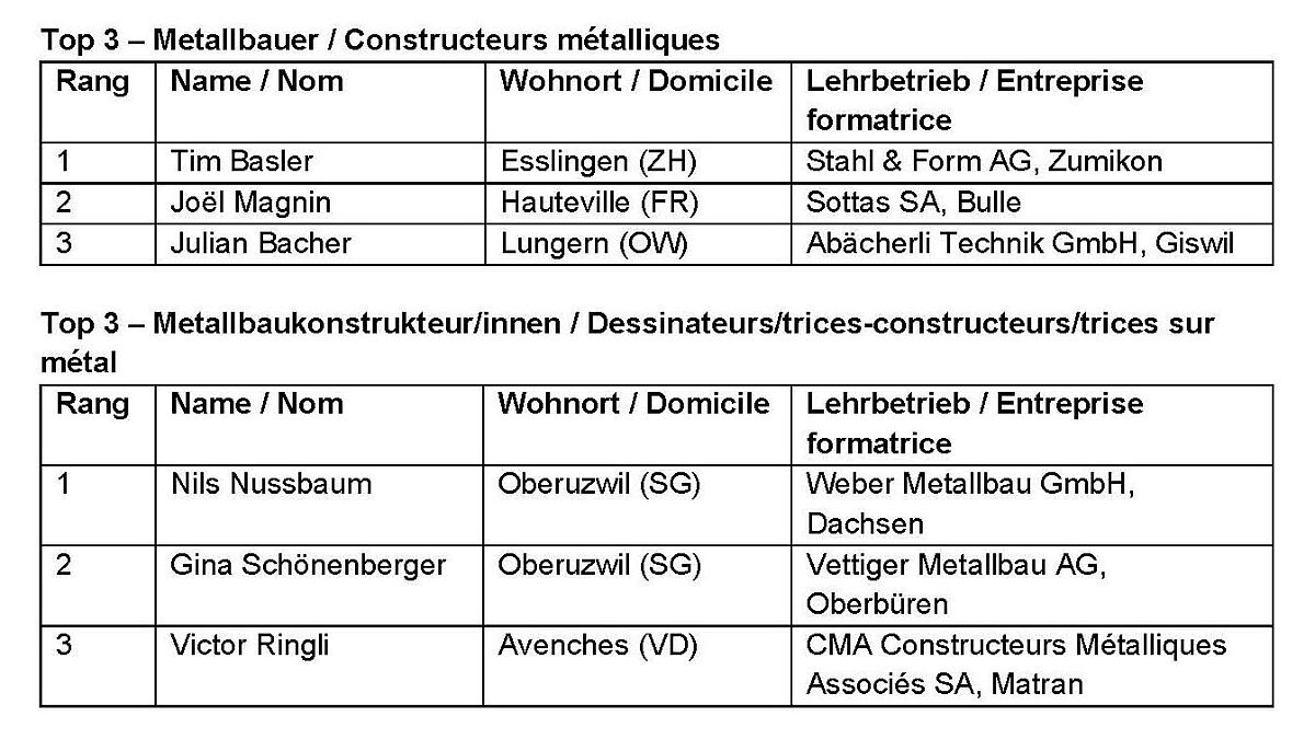 Die besten jungen Berufsleute traten vom 17. bis 21. September in Bern zum vierten Mal an den zentralen Berufsmeisterschaften gegeneinander an. Insgesamt massen sich über 1000 Wettkämpfer/innen aus 92 verschiedenen Berufen. Mit dabei waren auch die beiden Lehrberufe der Metallbaubranche. Am Schluss dominierten Metallbauer Tim Basler aus Esslingen (ZH) und Metallbaukonstrukteur Nils Nussbaum aus Oberuzwil (SG) und holen sich Gold.