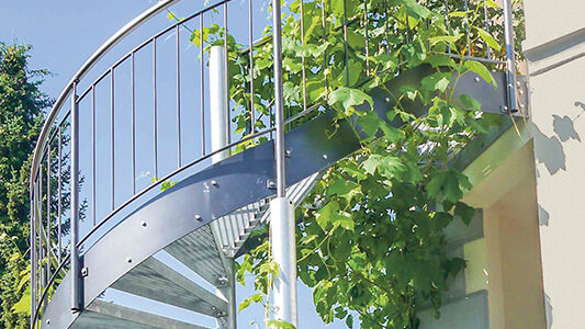 Die Besitzer eines privaten Wohnhauses in Oberkirch sehnten sich schon länger nach einem direkten Zugang von den Obergeschossen in den Garten. Die bestehende Bausituation und der Wunsch nach einem Zwischenpodest mit Ausgang erforderten spezielle Lösungen mit vertikal versetzten Spindeln sowie einem Mix aus gewendelten und geraden Treppenwangen.