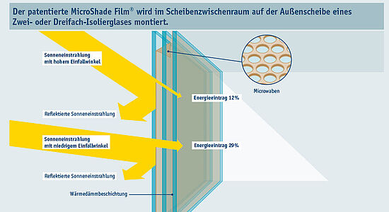 Sonnenschutzanlagen werden an der Aussen- oder Innenseite von Verglasungen angebracht, um durch Verschattung einen Sonnenschutz zu bieten. Ein aussenliegender Sonnenschutz grenzt den Gestaltungsspielraum für Fassaden erheblich ein. Ausserdem sind solche Sonnenschutzeinrichtungen in zahlreichen Anwendungsfällen nicht einsetzbar: z. B. bei hohen Windlasten.
