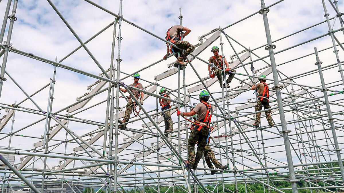 « L’arène de fête hexagonale – avec ses 800 m de circonférence, ses 250 m de diamètre et ses 17,5 m de hauteur de toit – offrira cet été à 50 900 spectateurs, qui pourront choisir entre des places assises ou debout, couvertes ou non couvertes, une vue sur les ronds de sciure », explique David Frei, responsable du projet. La construction des six tribunes nécessite au total environ 3000 tonnes de matériel, comprenant une ossature, des éléments de toiture et des sièges. Les tribunes arrivent progressivement sur le chantier sous la forme de 300 000 éléments individuels, tous là à temps pour le montage. La construction temporaire est durable grâce aux éléments réutilisables plusieurs fois et permet d’adapter l’arène en toute flexibilité aux conditions locales. De nombreux éléments montés ont déjà été utilisés pour l’arène d’une Fête fédérale antérieure.