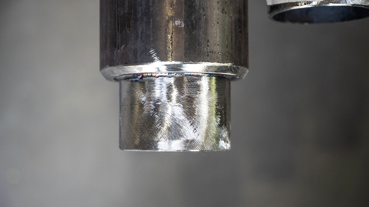 Vue détaillée d’un élément de pilier avec tube à pulsion et préparation du cordon de soudure.