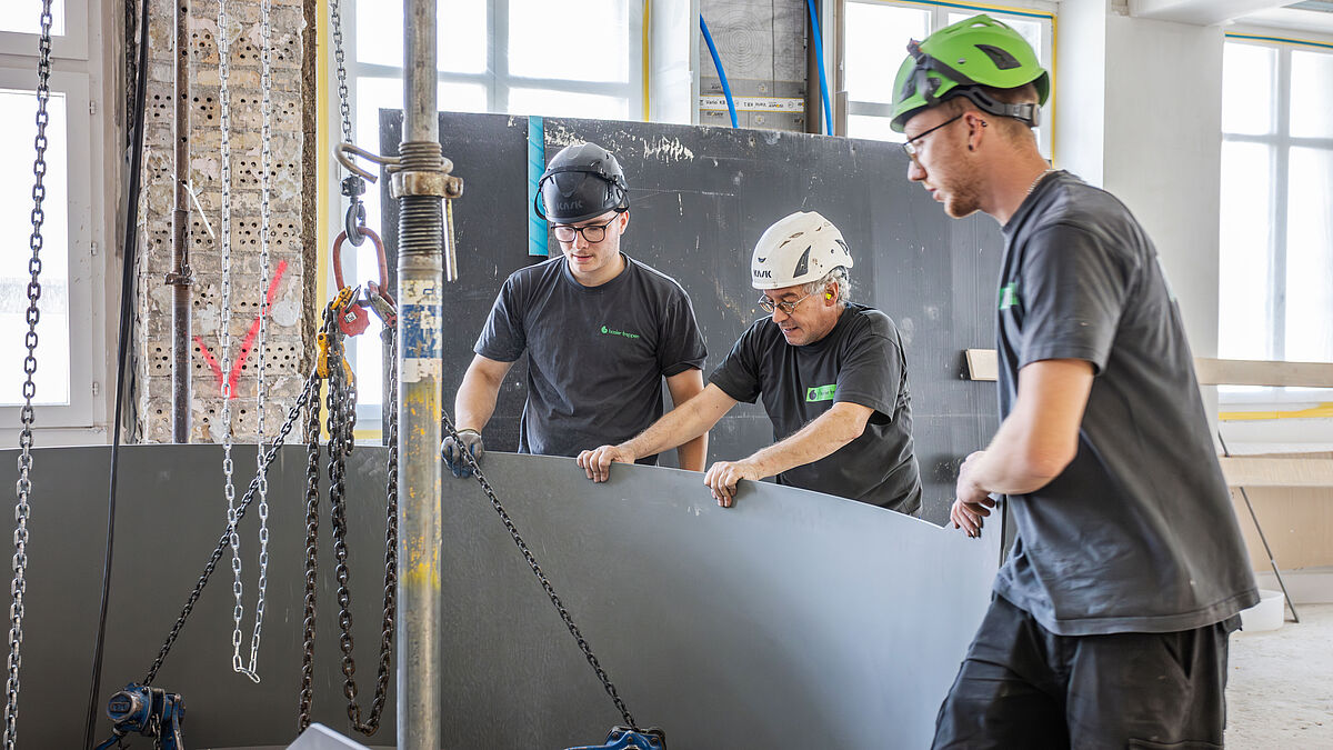 Les éléments ont été introduits horizontalement dans le bâtiment par une porte de garage. La photo montre la préparation pour le transport vertical vers l’étage correspondant.
