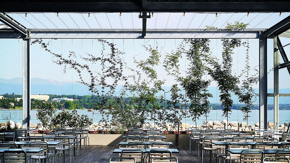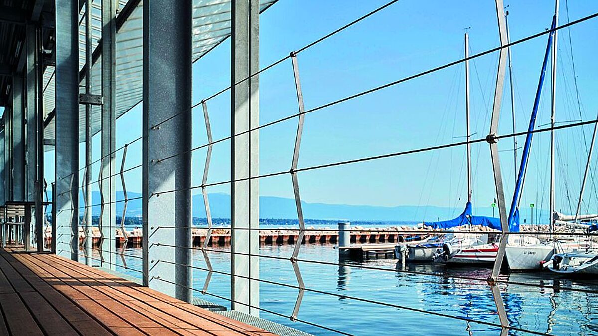 Les surfaces recouvertes de Webnet confèrent une ouverture particulière aux bâtiments en acier situés au bord du lac Léman. L'architecture en acier intègre les filets et les cordes de Jakob comme éléments de façade discrets.