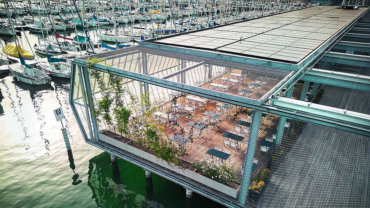 Le deuxième bâtiment en acier (Bâtiment môle) est un restaurant situé sur une grande plate-forme ouverte. Pour ce bâtiment, les architectes ont utilisé Webnet comme élément de façade sur de grandes surfaces. Les surfaces tendues restent ainsi légères et perméables. Les câbles tendus le long de la terrasse, qui forment une barrière extrêmement discrète par rapport à l'eau, ont le même effet et la même fonction. Pour les architectes, une transparence maximale sur de grandes surfaces était un détail important de leur planification.