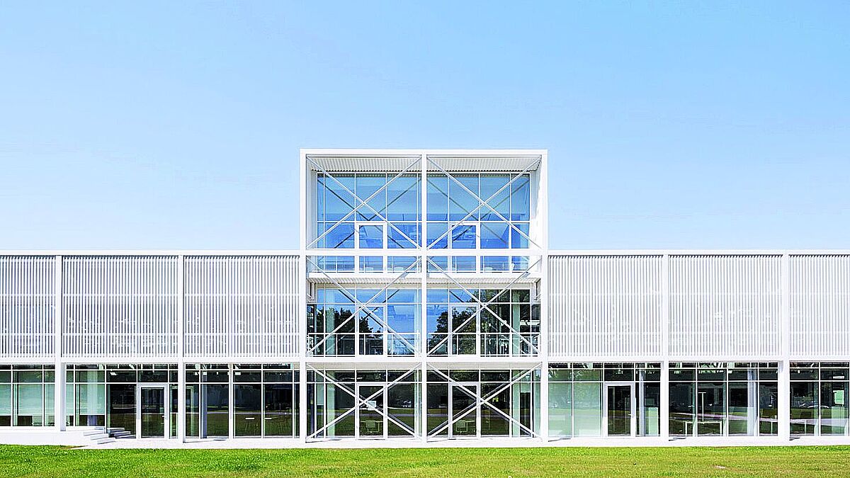 Les fermes en treillis d’acier du toit reposent sur des piliers en acier à l’extérieur, devant les façades. Derrière, les architectes ont installé d’étroits balcons en treillage ; à l’étage supérieur, les espaces entre les piliers sont en grande partie recouverts de tôle ondulée perforée offrant de l’ombre. En revanche, la façade vitrée au niveau du sol offre une vue dégagée sur la maison. Là aussi, comme sur la façade, le blanc est la couleur dominante. La vaste halle a été conservée sous la forme d’une succession de bureaux paysagers divisés par des cubes proposant de plus petites salles de réunion et de travail en groupe. ■