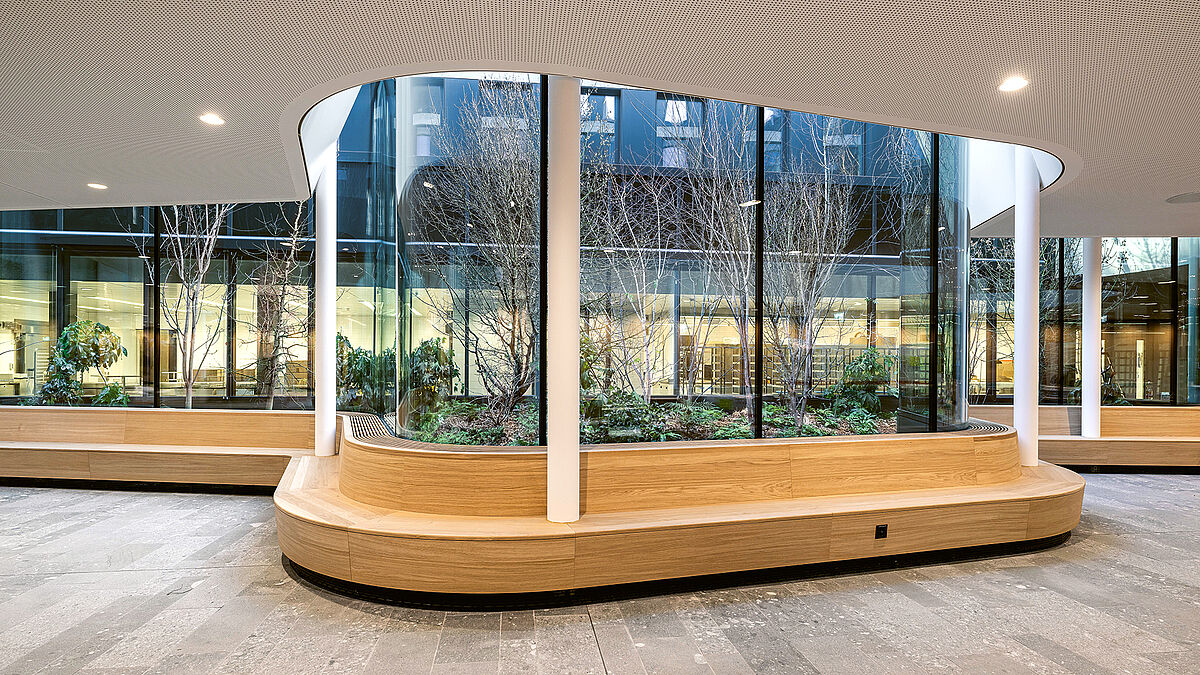 L’aspect hermétique de l’enveloppe extérieure du bâtiment tranche avec la « douceur » des façades donnant sur les cours intérieures. Pour celles-ci, Aepli Metallbau AG a conçu et réalisé une façade en aluminium ventilée avec des clapets d’aération/grilles. La cour intérieure centrale et ses vastes espaces de restauration reçoivent beaucoup de lumière zénithale directe et indirecte grâce à trois fenêtres de toit au langage organique et à des patios entièrement vitrés. Pour ces constructions, Aepli Metallbau AG a modélisé tous les éléments sur mesure en 3D. Cela a permis une planification de grande qualité. La réutilisation de ces données pour la production et le montage a constitué la base d’un résultat réussi.