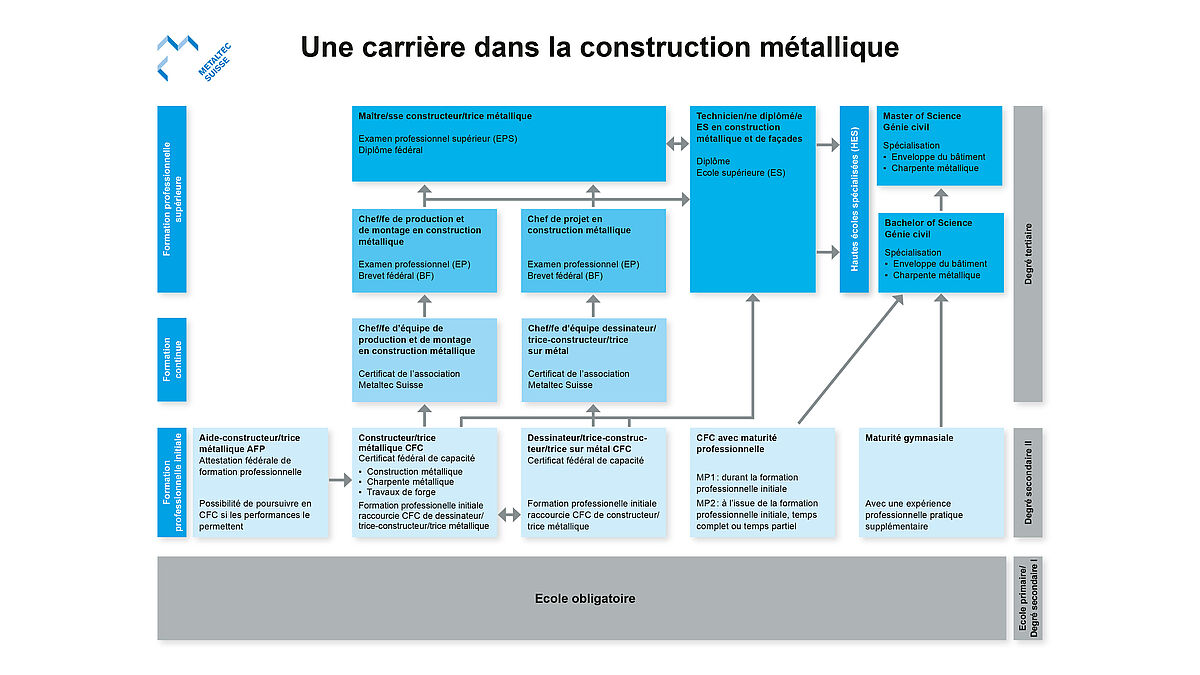 Avec le système de formation continue remanié, l’accent est mis sur les connaissances techniques et les compétences opérationnelles jusqu’au niveau de l’examen professionnel. Les notions de gestion d’entreprise sont principalement acquises par la suite au niveau de l’examen professionnel supérieur (EPS) avec le diplôme fédéral de maître constructeur/trice métallique.