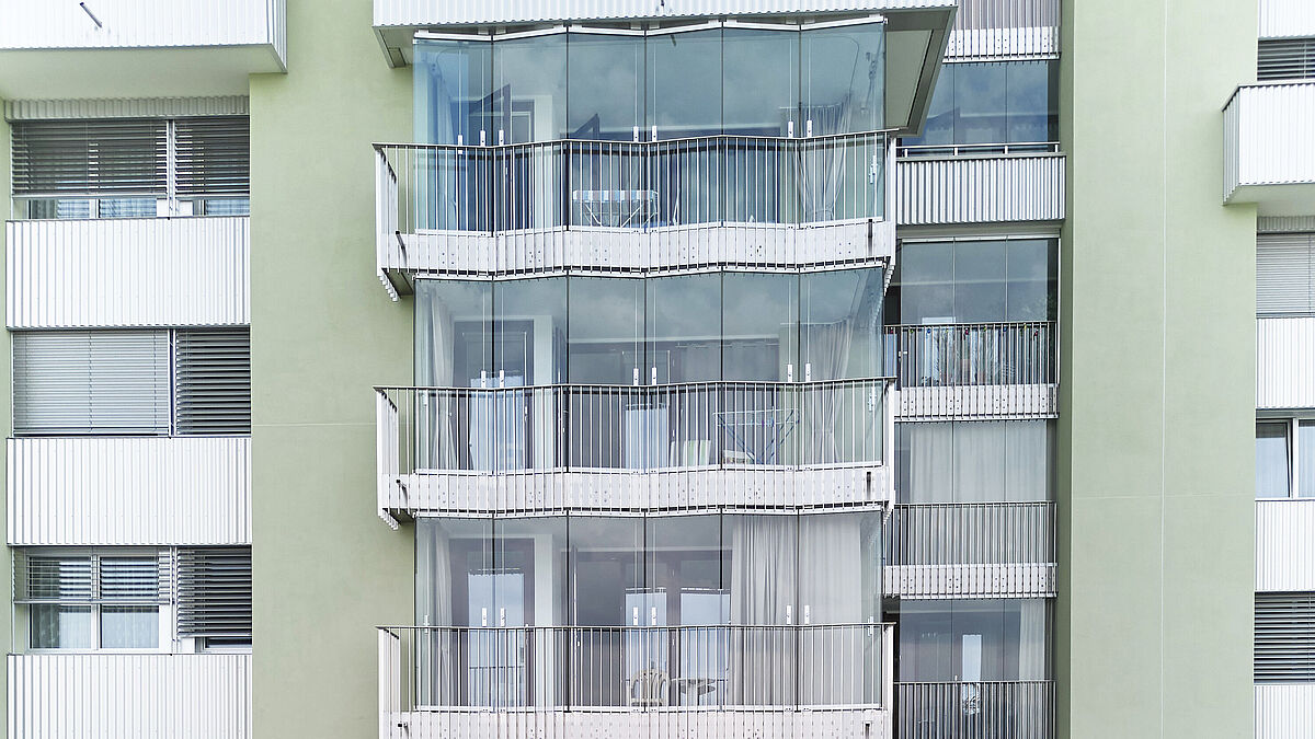 En observant le bâtiment à distance, on distingue deux types de balcons différents. Huit tours-balcons présentent chacune deux angles et sont à facettes à l’avant. Deux autres tours-balcons sont reconnaissables au fait qu’elles sont entièrement encastrées dans le bâtiment. Elles ont toutefois quelque chose en commun : chaque balcon s’est transformé en agréable jardin d’hiver et offre aux habitants un espace de vie supplémentaire pendant au moins neuf mois par an. Les vitrages hautement transparents s’ouvrant de tous les côtés protègent du vent et des intempéries et, comme l’explique avec enthousiasme une résidente, absorbent aussi considérablement le bruit des avions au décollage et à l’atterrissage. Si le rayonnement solaire est trop intense, il est possible de lutter efficacement contre ce phénomène en tirant les rideaux intérieurs en textile.