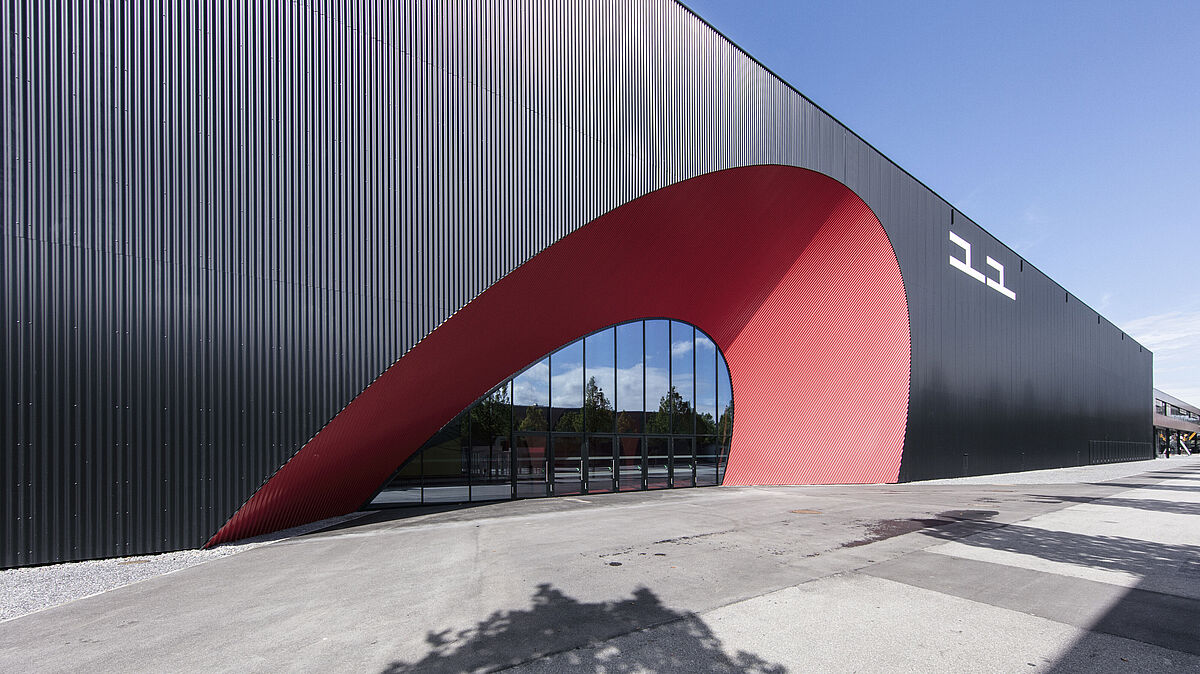 À l’extérieur, le monolithe est entièrement enveloppé de tôle ondulée noire. Le profil vertical fin de la tôle apporte du relief à l’énorme façade fermée. Sur les deux côtés longitudinaux de l’édifice, trois découpes marquantes en formes d’hyperbole permettent de diviser la surface. Ces incisions en rouge carmin lumineux marquent les entrées des halles respectives. Du côté est, le public pénètre dans le complexe par un portail spectaculaire de forme elliptique dont l’ouverture se réduit vers l’intérieur, jusqu’à déboucher sur une vaste façade en verre galbée dotée de six portes. C’est ici que l’on accède au cœur du quartier: le «foyer rouge». Sur le plan architectural, ce hall d’entrée entièrement rouge surprend par des arcades intérieures en béton dotées de cinq ouvertures elliptiques – une structure festive qui transforme l’espace en une salle de réception abstraite.