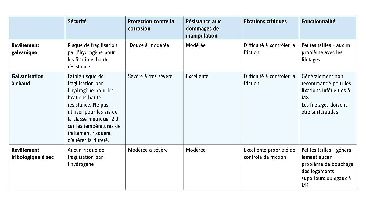 Une finition sûre doit éviter tout risque de fragilisation par l’hydrogène. La fragilisation par l’hydrogène est une casse catastrophique différée d’une fixation haute résistance exposée à l’hydrogène et soumise à une charge de traction.