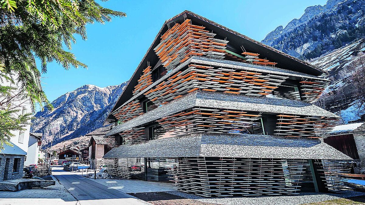 Le bâtiment, également appelé « Balma », porte la signature du célèbre architecte japonais Kengo Kuma. Le maître d’ouvrage, l’entreprise de transformation de la pierre Truffer AG à Vals, extrait du quartzite depuis plus de 40 ans au sud du village. Le quartzite de Vals, également appelé gneiss de Vals, est une pierre ardoise à grain fin, d’aspect gris à verdâtre. Avec ses veines et ses yeux clairs, il est considéré comme très varié.