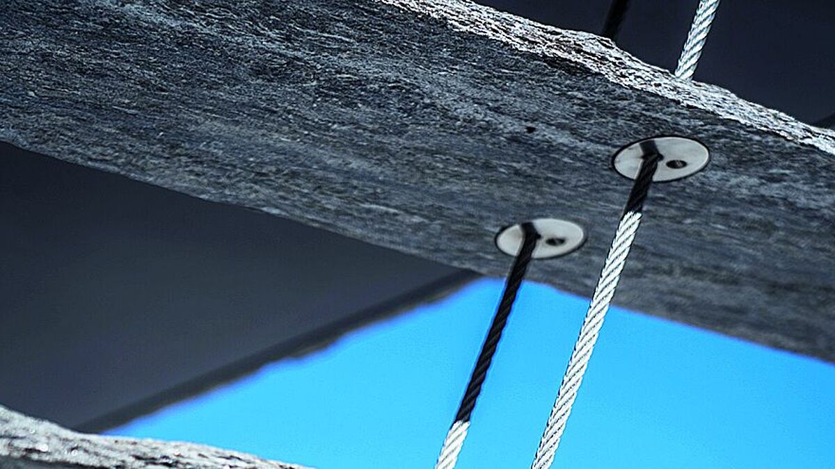 Les plaques de pierre et de mélèze placées devant l’enveloppe de façade à isolation thermique semblent flotter. Sur des câbles en acier inoxydable de 8 mm de diamètre tendus verticalement en diagonale, elles reposent sur quatre douilles de câble rondes noyées dans les plaques. En raison des différents tracés obliques des câbles, une grande variété de douilles de câble, avec des trous obliques différents, était nécessaire. Ainsi, les 5534 douilles de câbles présentent au total 55 géométries de serrage différentes. L’effet de serrage est obtenu par des vis sans tête. Les 460 câbles en acier inoxydable peuvent être divisés en 262 longueurs différentes pour une longueur totale de 1055 m.