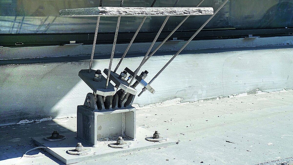 Le serrage des câbles métalliques s’effectue en bas à l’aide de dispositifs de serrage spéciaux dotés de bascules articulées. Les câbles en acier inoxydable constamment sous traction doivent pouvoir prendre en charge et absorber la traction générale ainsi que les forces de traction supplémentaires dues au vent ou aux réductions de longueur résultant des variations de température. La tension de câble calculée et réglée est généralement de 500 kg par câble. Cela permet d’obtenir une stabilité en cas de surtension de 15 mm, de sorte que les câbles ne vibrent que légèrement, même en présence de vent fort ou d’excitation manuelle. Les valeurs statiques proviennent du module statique du fournisseur de câbles Jakob Rope Systems. À titre de comparaison, pour la maquette, les câbles ont même été soumis à une charge de 1000 kg à des fins d’essai.