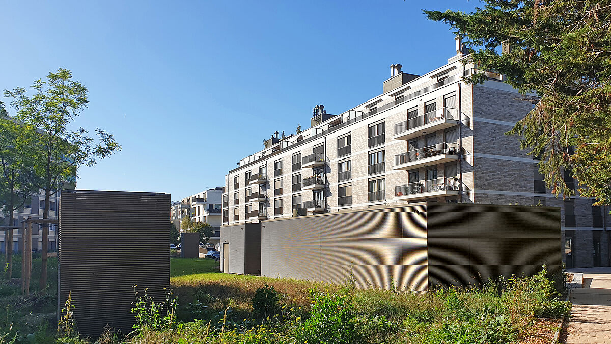 L’immeuble avec sa façade ventilée en céramique et dotée de divers revêtements extérieurs se trouve dans la commune de Vernier, entre l’avenue de Châtelaine et la route de Meyrin, juste aux portes du centre-ville de Genève. Sur mandat d’Urban Project SA, le bureau d’architectes Groupe H a conçu cet immeuble résidentiel impressionnant sur le plan visuel et pionnier en matière de durabilité. Avec 48 appartements en copropriété, un parking souterrain de 96 places et 4504 m2 de surfaces communes avec jardins publics, il se démarque dans les environs avec le bâtiment voisin, également réaménagé par Groupe H. Il ressemble à un puzzle urbain de différents styles architecturaux. Des appartements communautaires modernes et densément peuplés alternent avec des jardins et des villas des années 1960. Le projet de Groupe H trouve un équilibre dans ce contexte architectural et donne au quartier une identité plus urbaine et plus vivante.