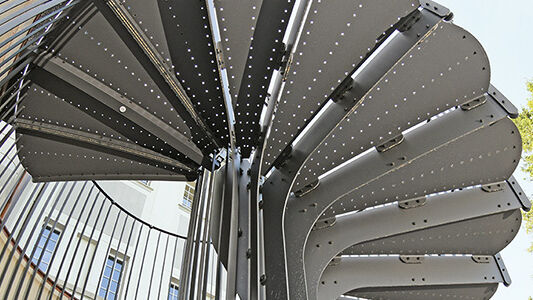 Dans le cas présent, il s'agissait de proposer avec le nouvel escalier de secours un prolongement esthétique de l'ouvrage fin existant, à savoir les balustrades en fer. Nous avons cherché à reproduire la finesse et la légèreté des travaux de forge déjà réalisés en ajoutant de multiples pièces préusinées. Découpées au laser et uniquement pourvues d'arêtes ou de courbes épurées, ces pièces simples ont été assemblées pour obtenir la forme complexe d'un escalier en colimaçon.
