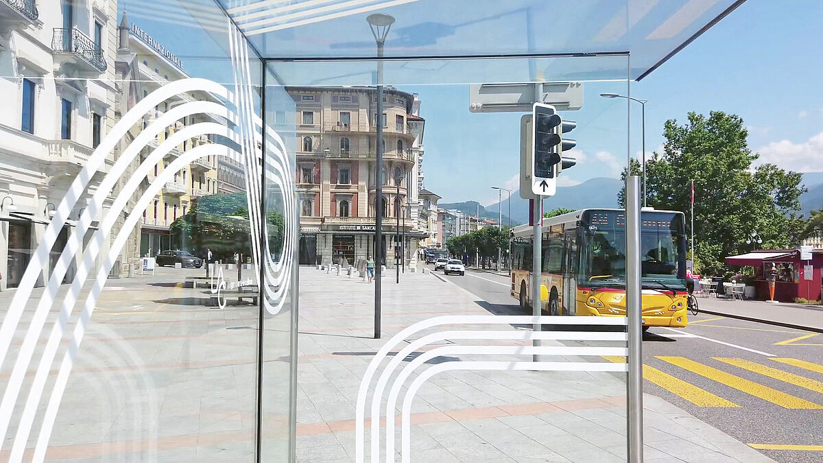 «Ii tema architettonico di questo piccolo oggetto posato su Piazza Luini – di cui il nostro studio ha curato a livello progettuale anche la pregiata pavimentazione, in continuità con quanto realizzato negli anni in tutto il Nucleo Tradizionale - è stato quello di realizzare una struttura trasparente che quasi non occupasse lo spazio pubblico, ma che al pubblico offrisse la giusta opportunità di attendere i mezzi di trasporto al riparo degli agenti atmosferici. Nell’intento progettuale la piccola pensilina doveva essere completamente di vetro, essere quasi impalpabile per non disturbare le viste che si incrociano e si sommano verso la chiesa di Santa Maria degli Angioli, il Palace, il LAC e il lago con il golfo verso il Monte Bré.